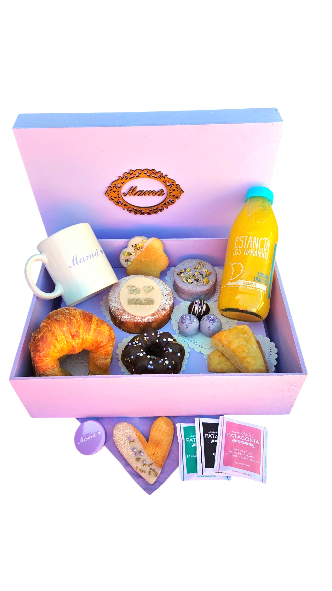 Caja de madera con tapaen color lila . Aplique mamá en dorado