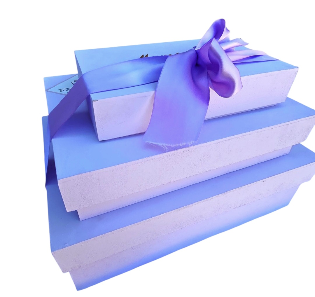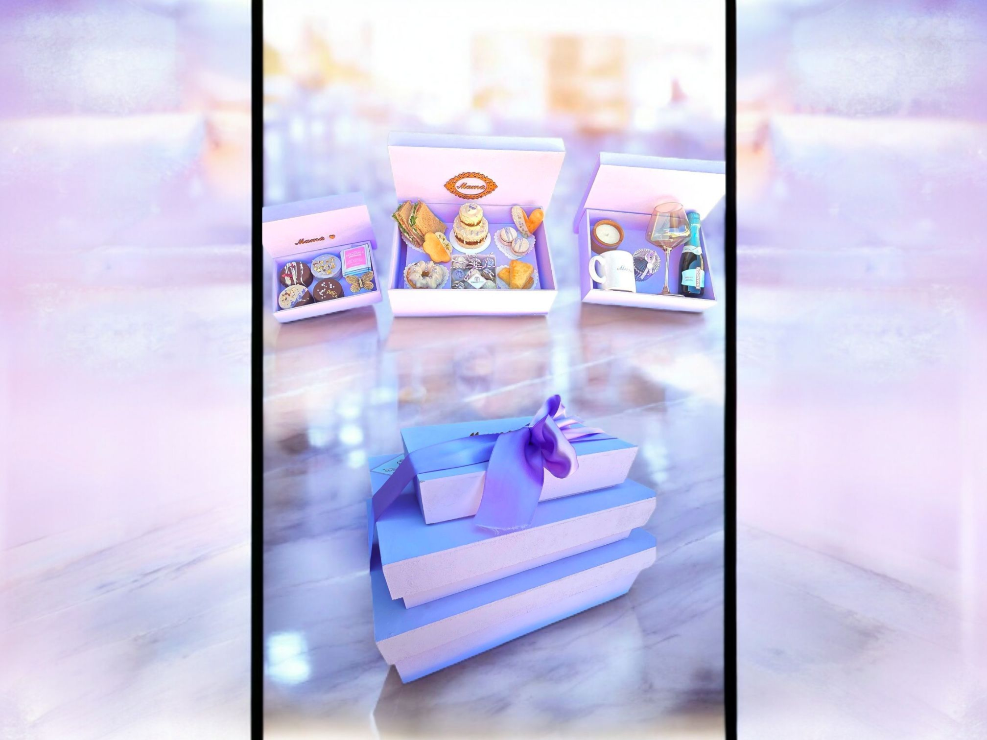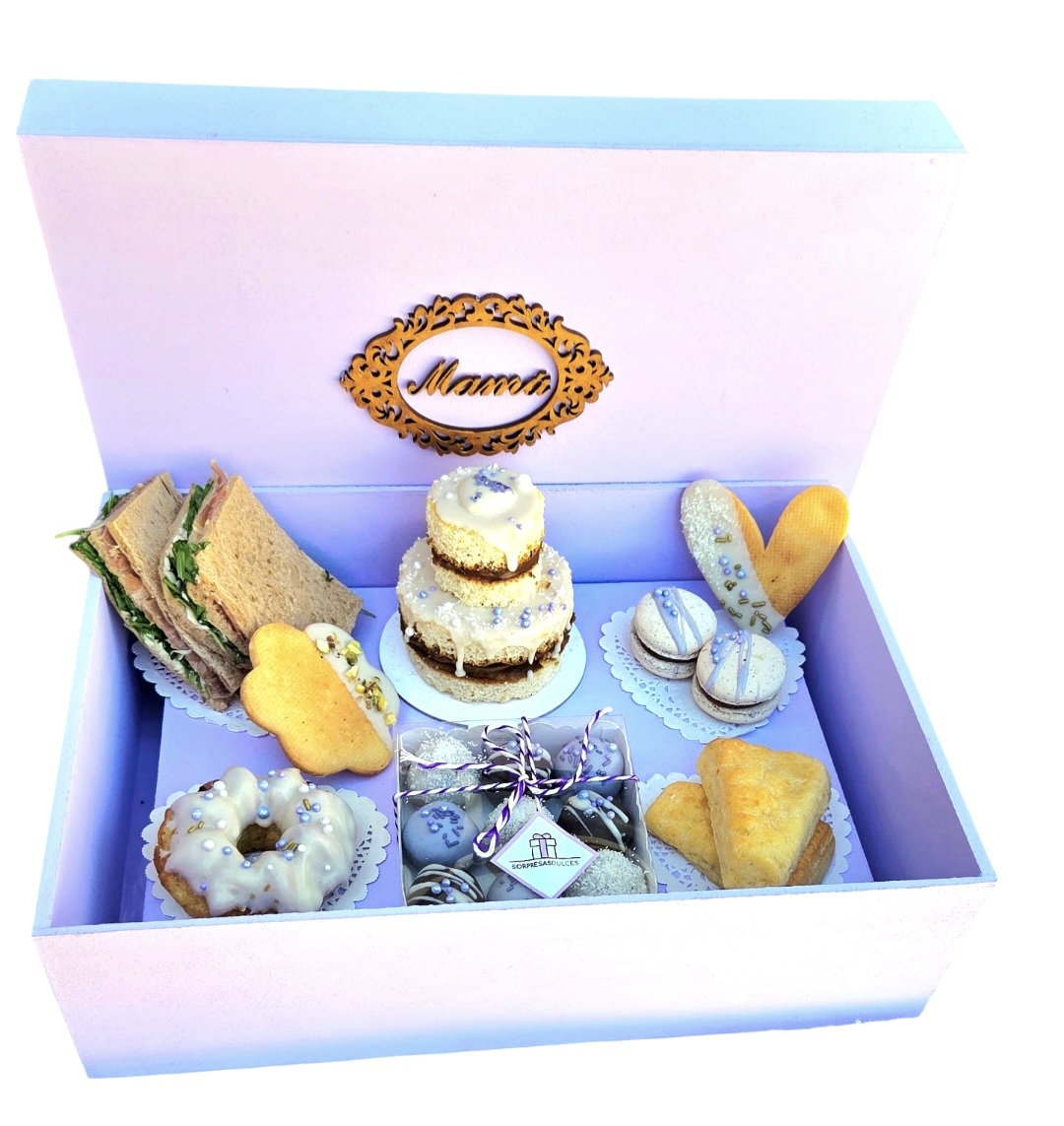 Caja grande: triple de miga jamón crudo, rúcula y queso. Caja selección de trufas, budín glaseado de limón, scones de queso. Macaron, cookies diseño, mini torta 2 pisos.