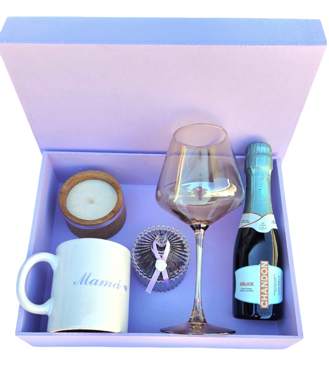 Caja mediana: vela en cuenco de madera. Copón Amabar. Chandon delice 187 cc. Caramelera vidrio con té en hebras Hibiscus.